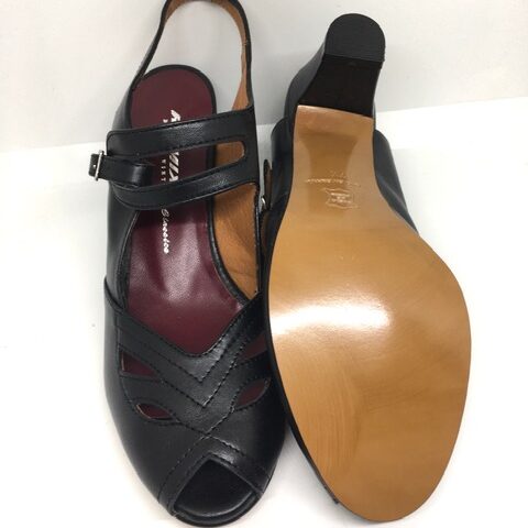 Anita is a 1930’s style peep toe sandal with intricate vamp perforations and a distinctive “U” shape arch strap and buckle.