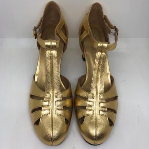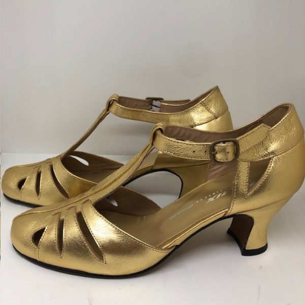 Our most popular style! Elegant 1930’s T-strap with fluted heel.