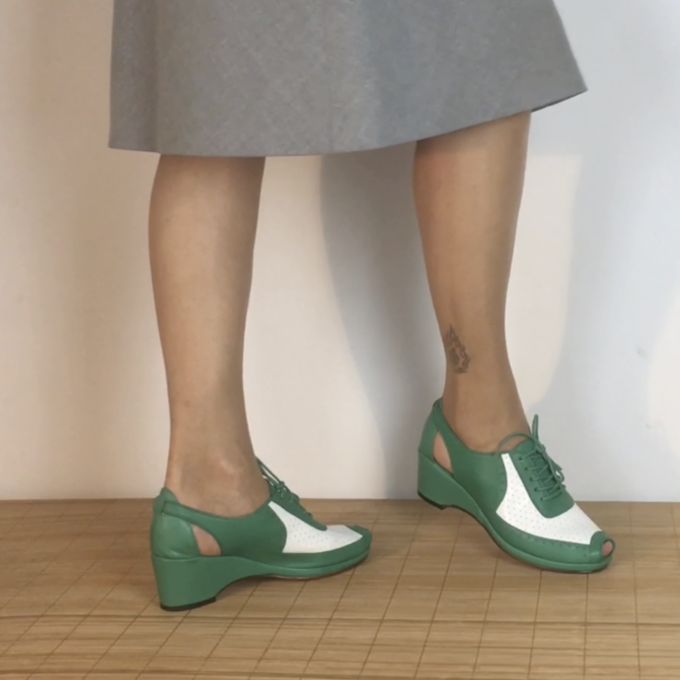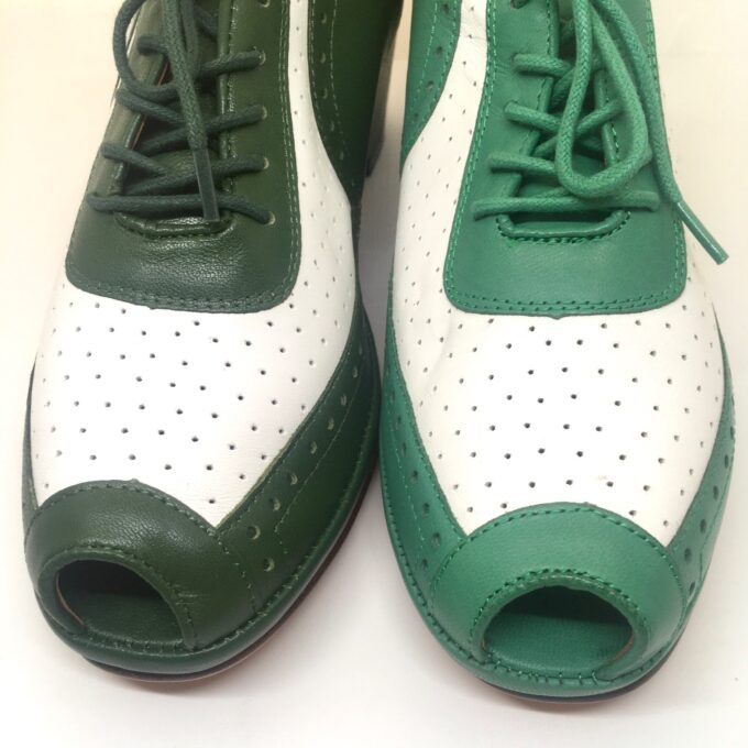 These classy two-tone Spectators were one of the earliest Re-Mix models and are – if worn with stockings – the perfect shoe for spring or fall. The heel is almost closed and the shoe sits tight on the foot so size up if you are in between numbers.
