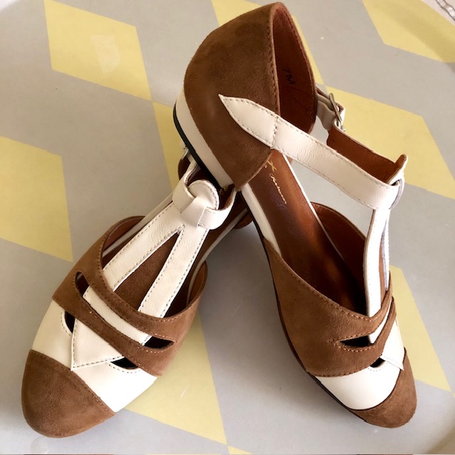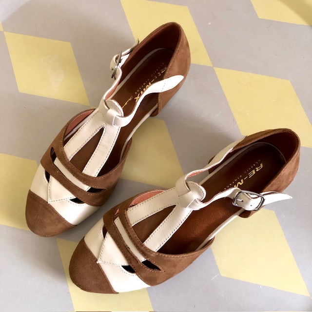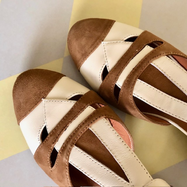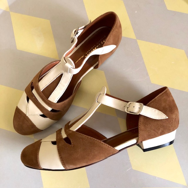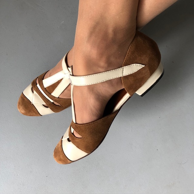 Trudy is a flat 1920/30s shoes with art deco drop shaped T-Strap and a wide closure strap.