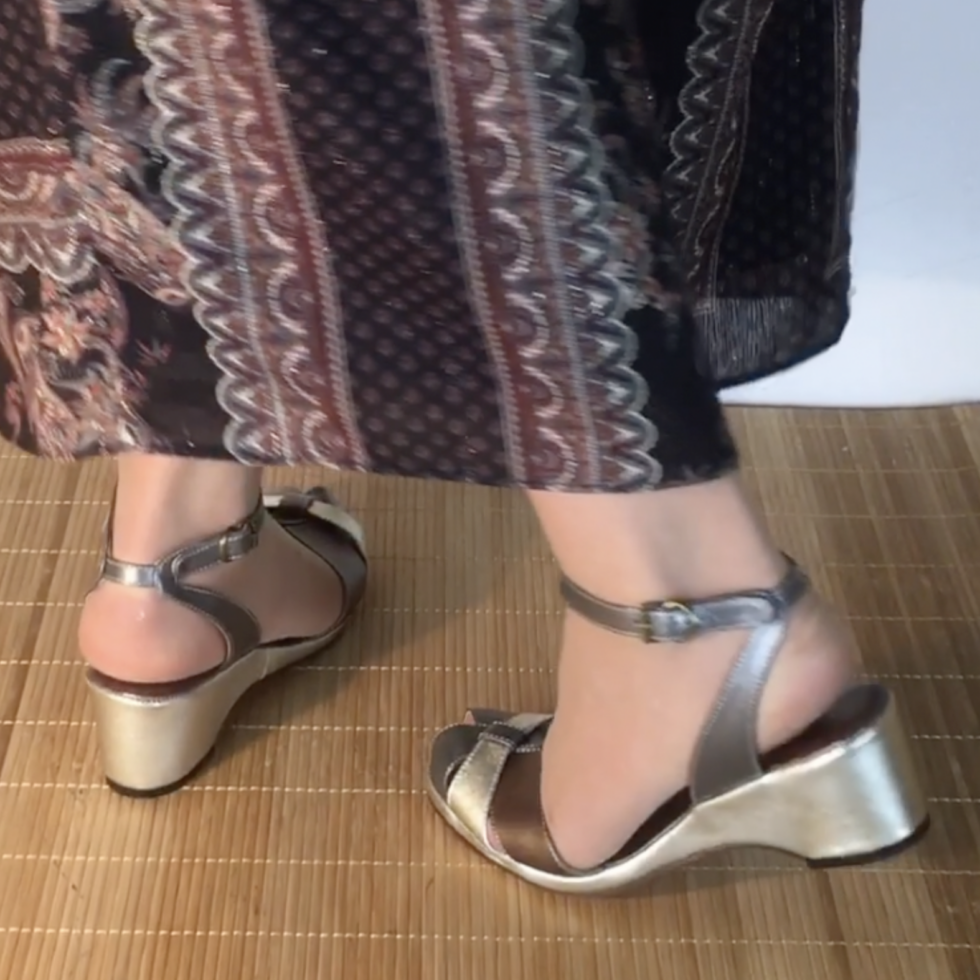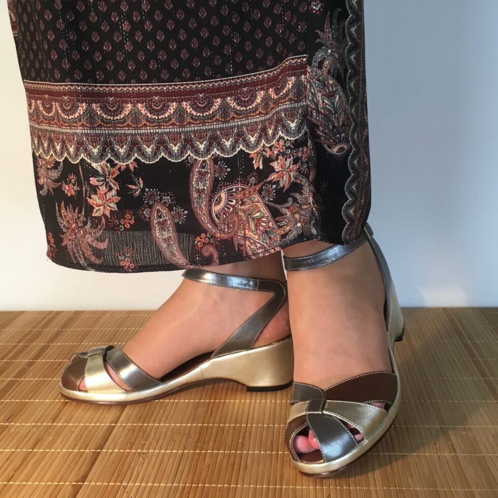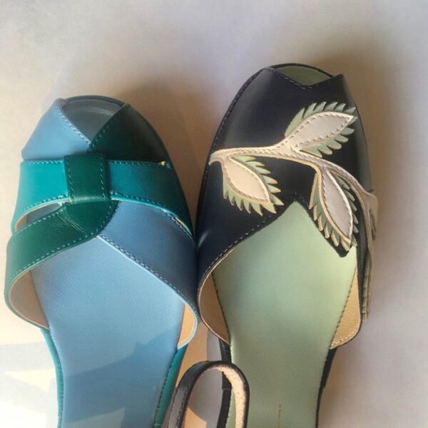 Capri ist eine 1950er Sandale, die mit sexy Fesselriemen und toller Farbkombination punktet. Zur Beachtung: der Vorderfußbereich ist um einiges kürzer als bei unseren anderen Wedges und bietet daher bei schmalen Füßen nicht so viel Halt (siehe Vergleichsbilder Pleated Toe und Flora).