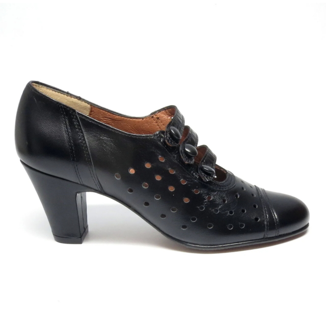 Cassandre ist ein eleganter Pump aus den späten 30er Jahren mit Lochmuster und funktionstüchtigen Knöpfchen.