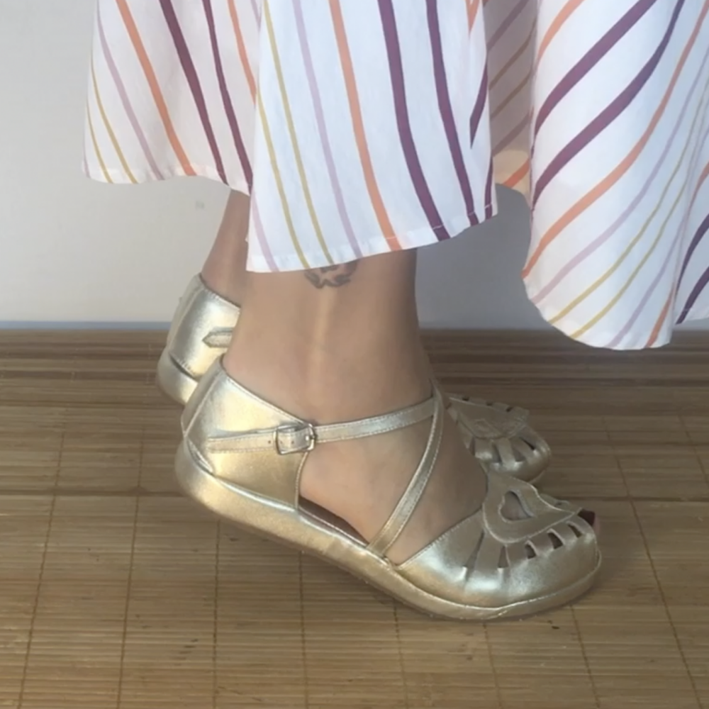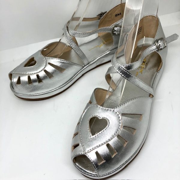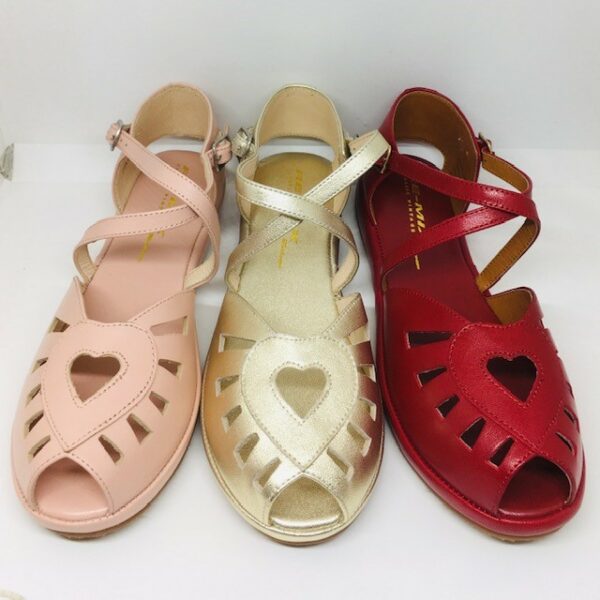 Corazon ist eine flache Sommersandale aus den 1950ern mit Kreuzriemen, Herz-Cutout und bequemer Laufsohle.