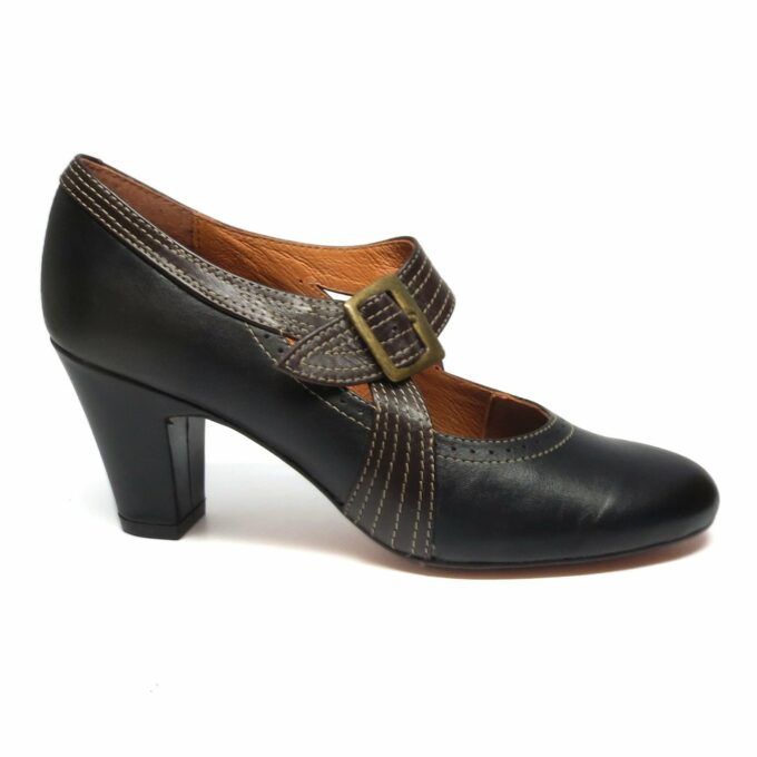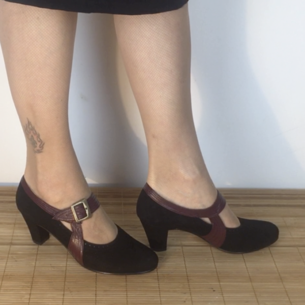 Ungewöhnlicher Mary-Jane mit breitem art-deco Verschluss.