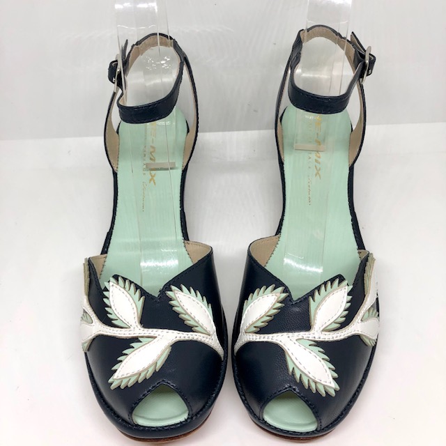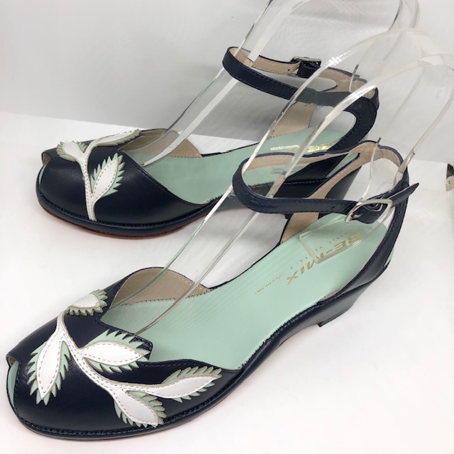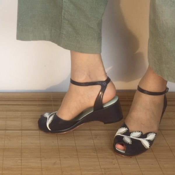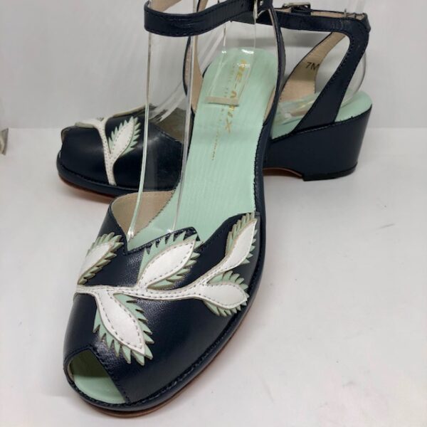 Flora ist eine 1950er Sandale, mit entzückender Blumenapplikation, Fesselriemen und toller Farbkombination.