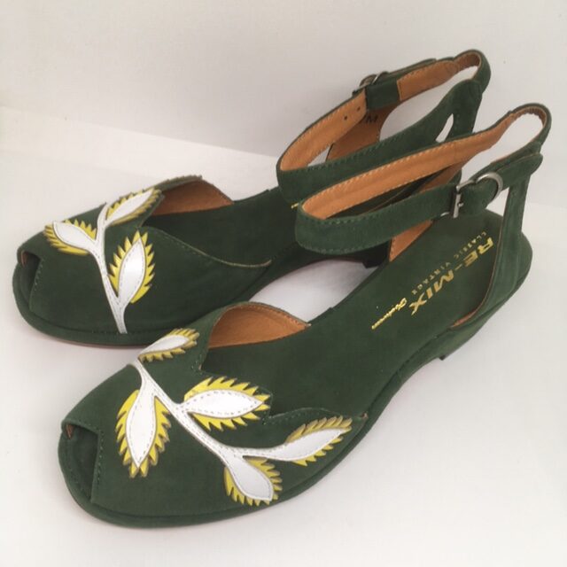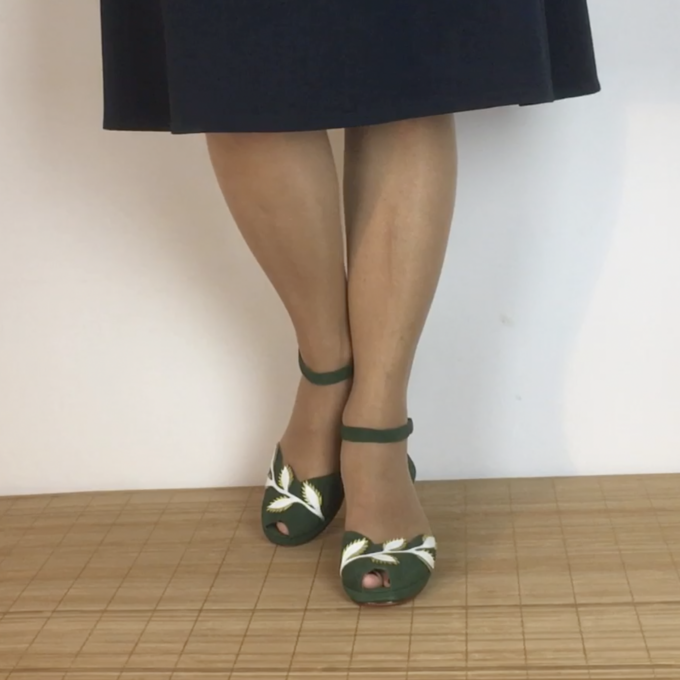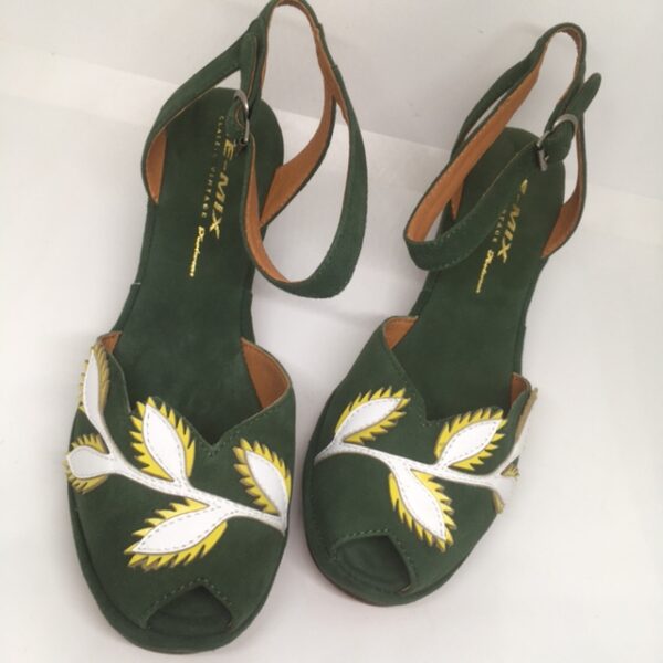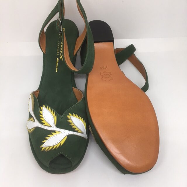 Flora ist eine 1950er Sandale, mit entzückender Blumenapplikation, Fesselriemen und toller Farbkombination.