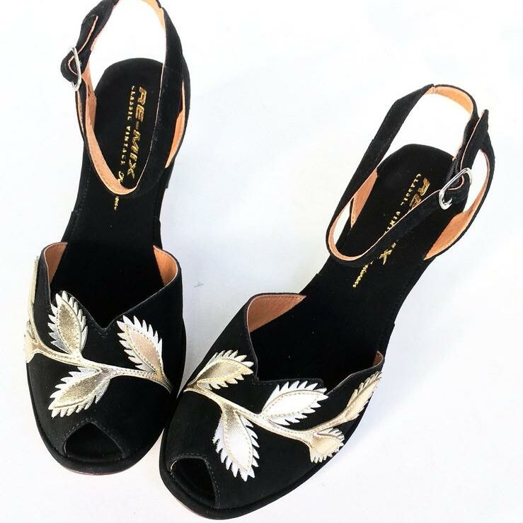 Flora ist eine klassisch-elegante 1950er Sandale mit entzückender Blätterranken-Applikation und Fesselriemen.