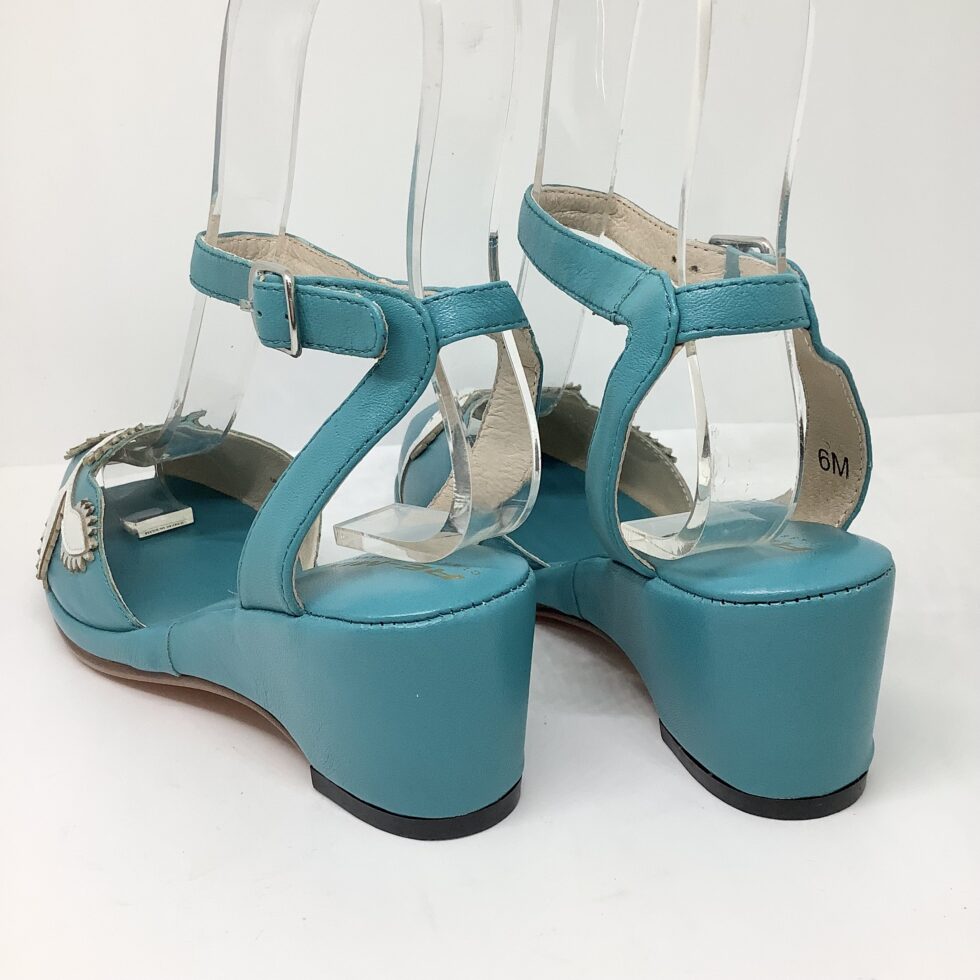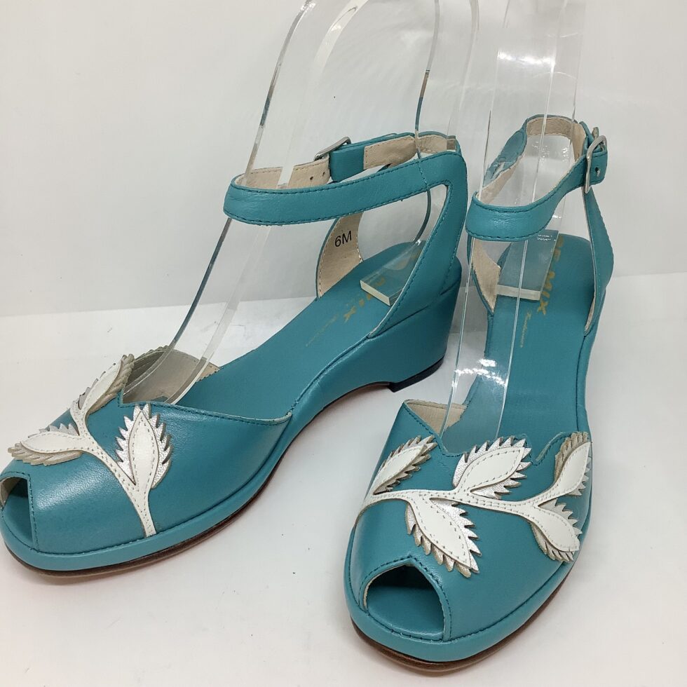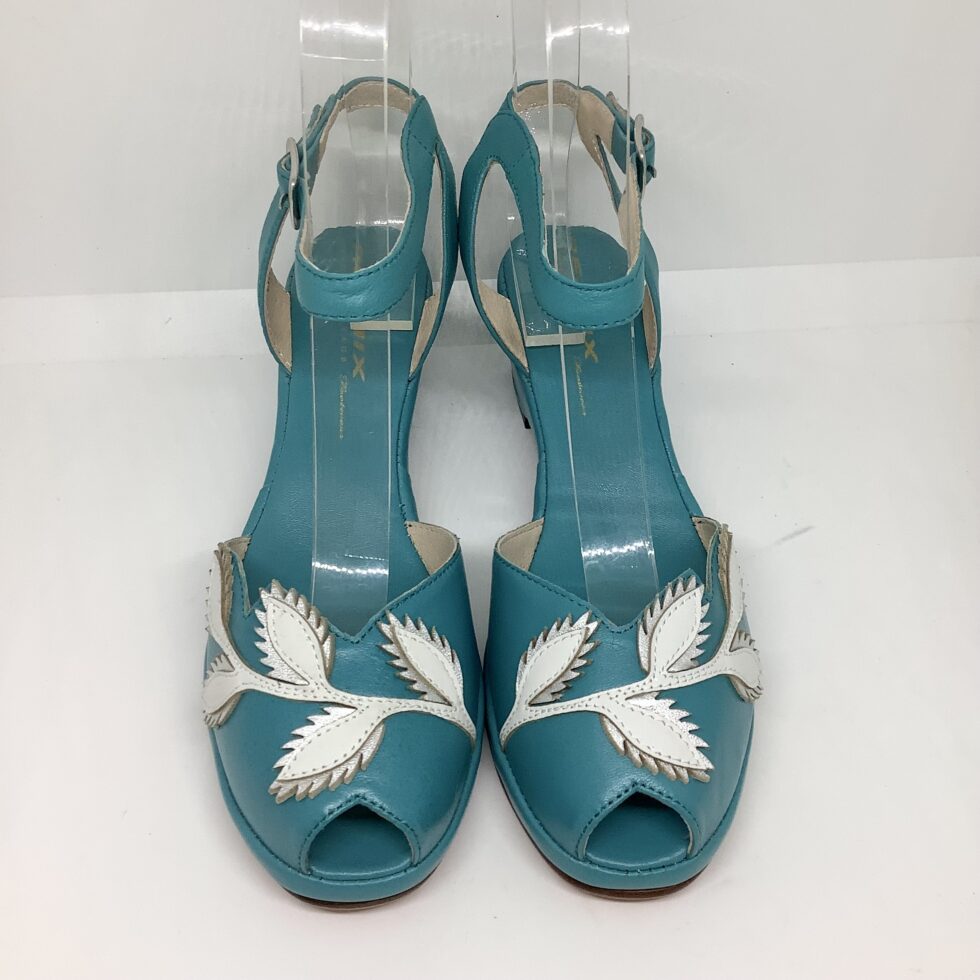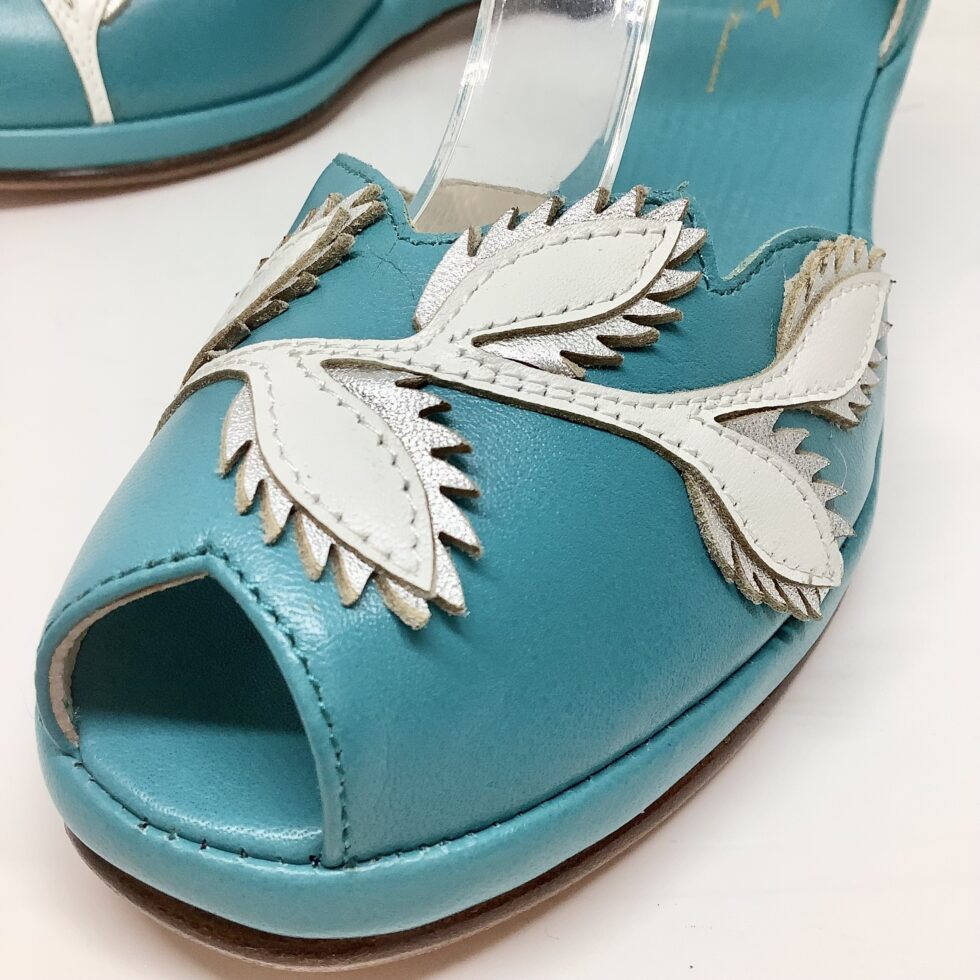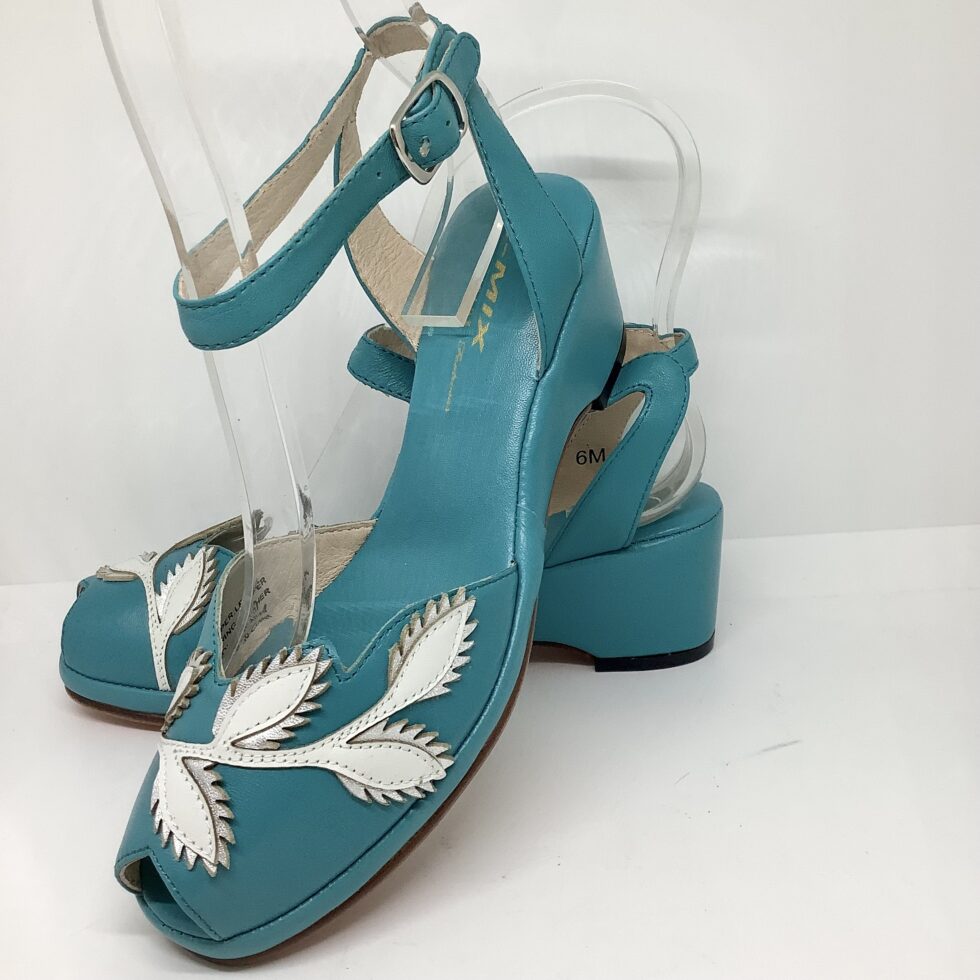Flora ist eine 1950er Sandale, mit entzückender Blumenapplikation, Fesselriemen und toller Farbkombination.
