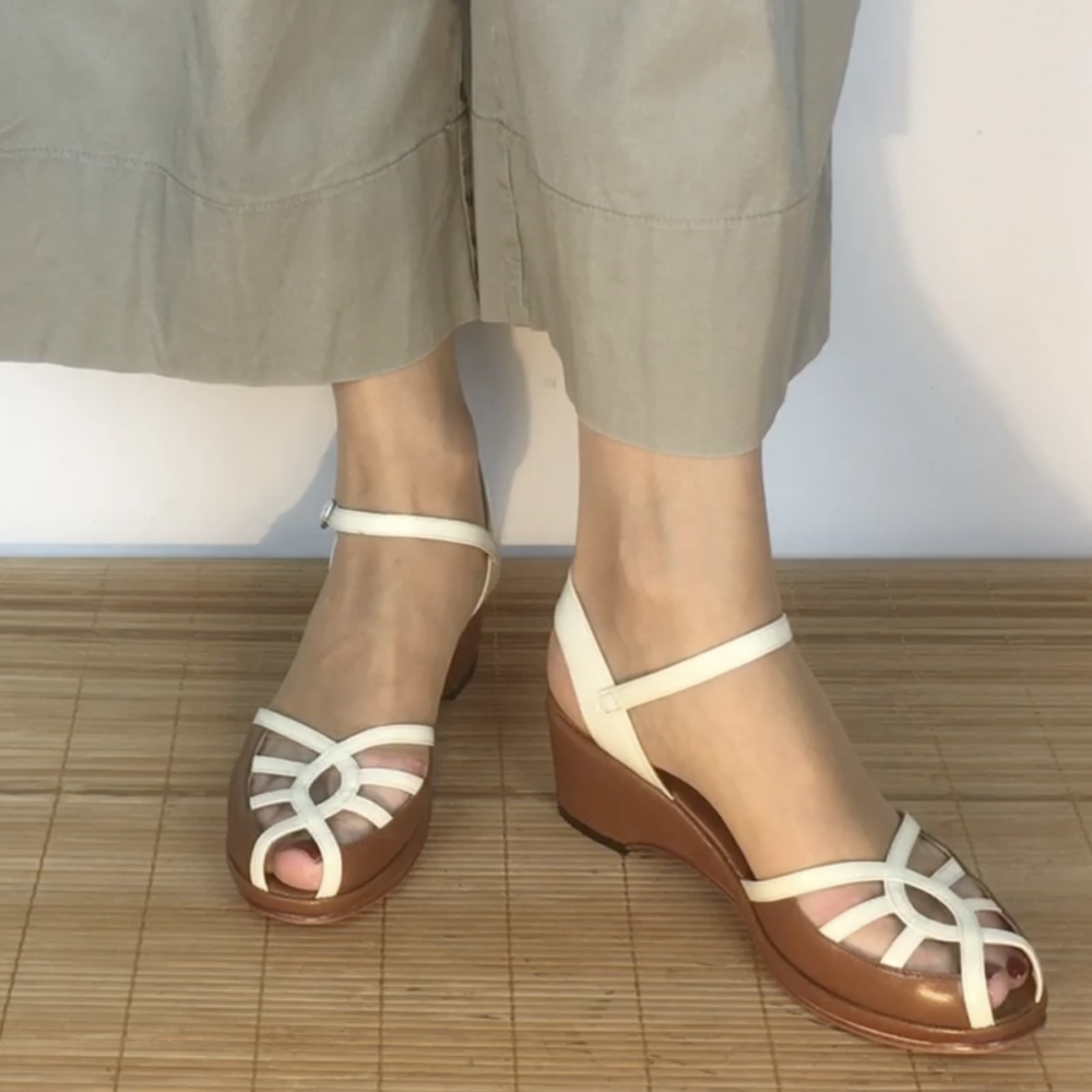 Zweifärbige 1950er Keilsohlen-Sandale mit hübschem Riemchendetail.
