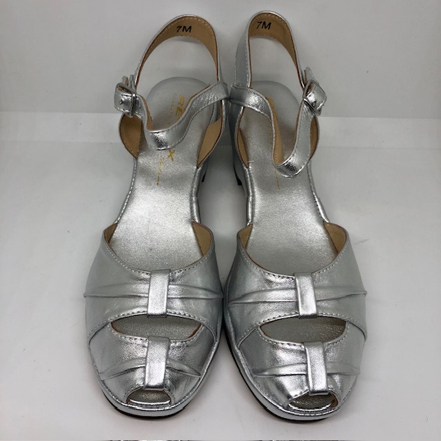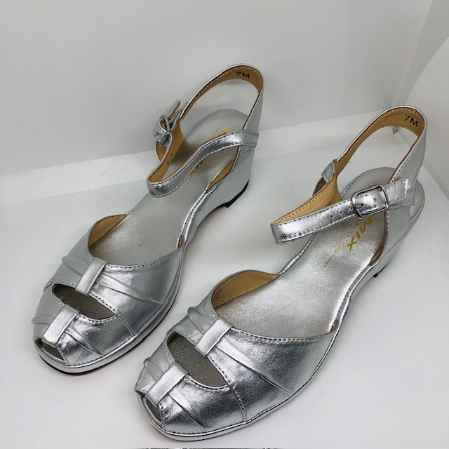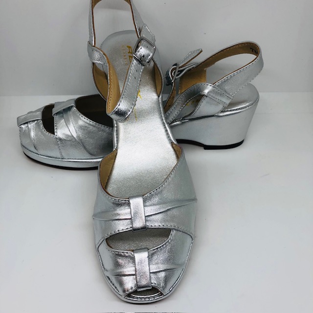| Dekade, Farbe, Absatz | 1940, 1950, Absatzhöhe 3–6 cm, Ballschuh, Fersenriemen, Keilabsatz & Sandalen, Ledersohle, Zehenloch |